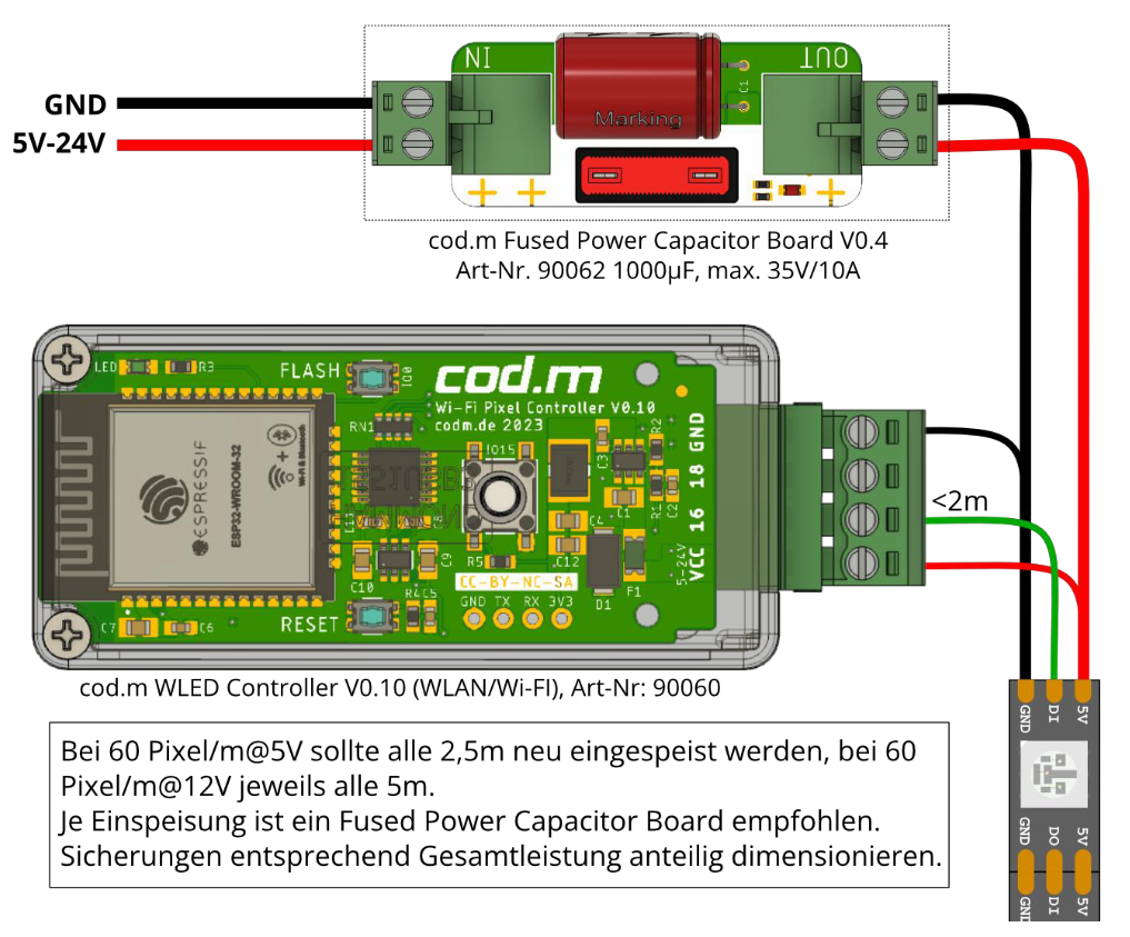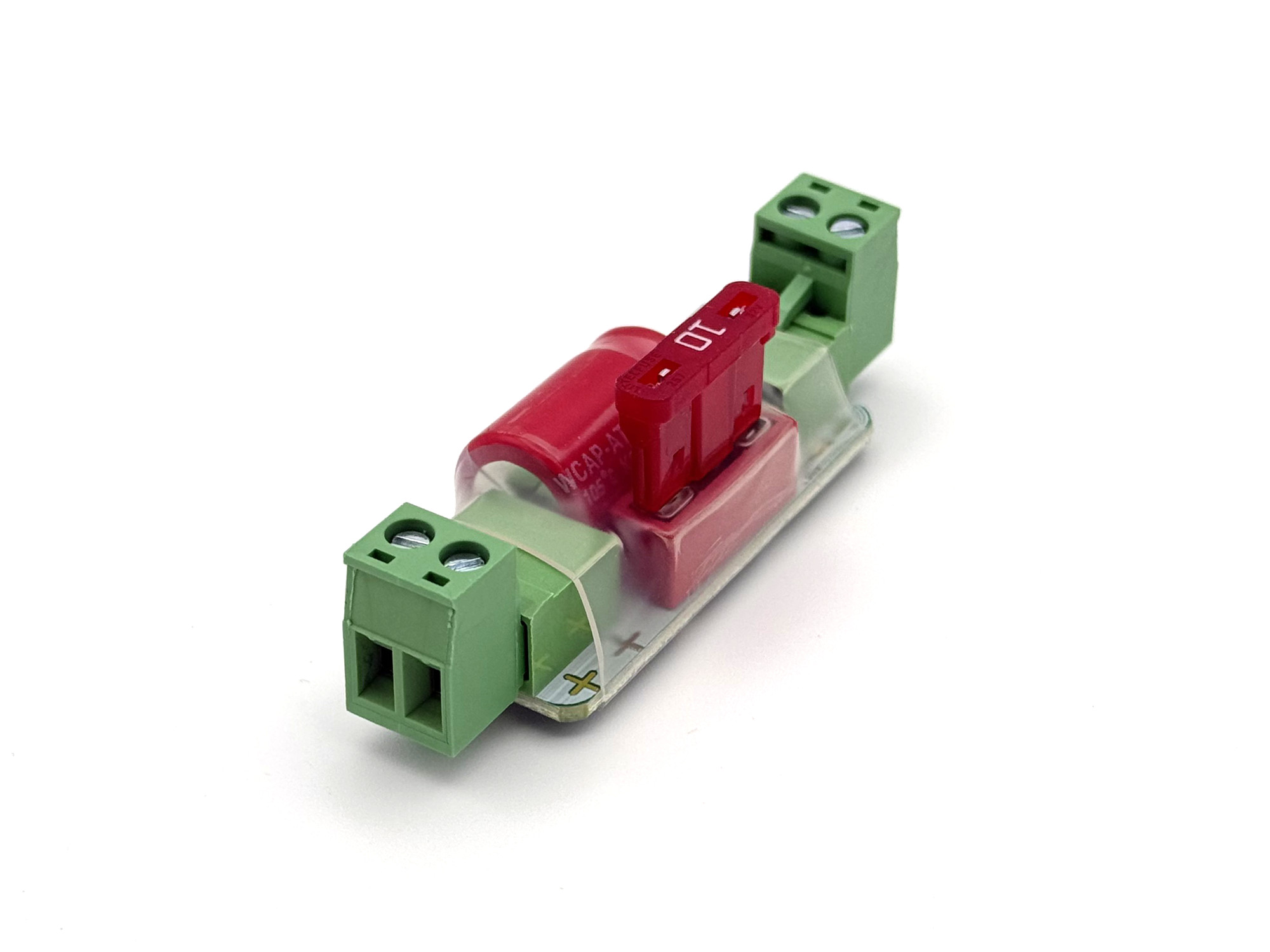 Kondensatorplatine mit integrierter Sicherung zum Schutz von WLED- bzw. Digital-LED-Installationen mit integrierter LED zur Anzeige einer defekten Sicherung. Für 5V-, 12V- und 24V-Installationen.